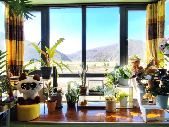 他在县城的出租屋两室一厅,一个月800元,换来的是窗外开阔的田野和远处的群山,冬季,雪山延绵,一幅自然馈赠的画。他在房间内摆满了绿植和花卉,高原干燥,他常浇水,这些花卉和植物比在上海生长得还要好。